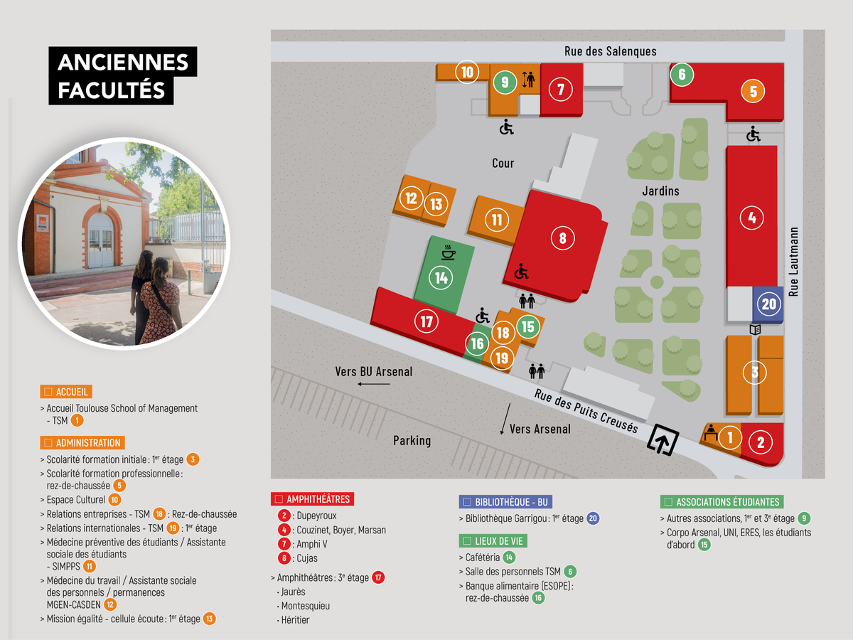 - Le campus de Toulouse est le siège historique de l’université. Il compte cinq bâtiments : l’Arsenal, les Anciennes Facultés, la Manufacture des Tabacs, TSE, Rempart.